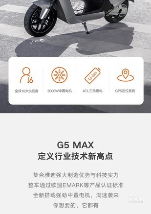 | 显示面板 | 7英寸智能中控大屏,提供多种UI界面,同时集合了胎压监测、车况信息和电量查看等功能,另外配合雅迪G5的智能应用,还可以实现来电显示、车辆定位等诸多扩展功能。 VA负显液晶仪表 |